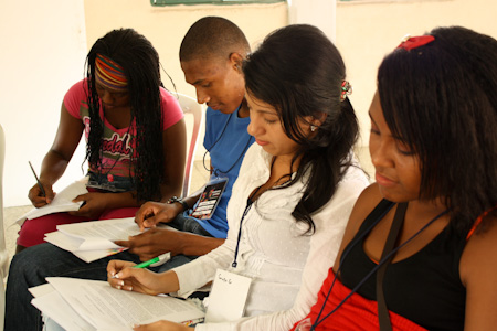 A group of youth from one of the regions represented at the conference engage in the study some the materials