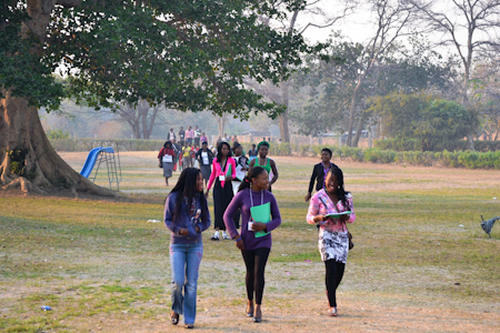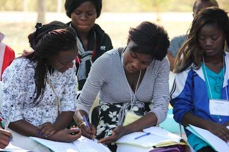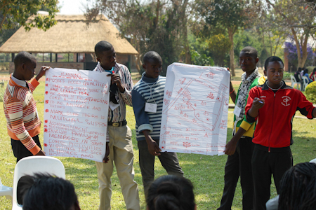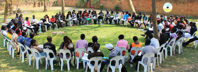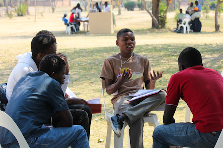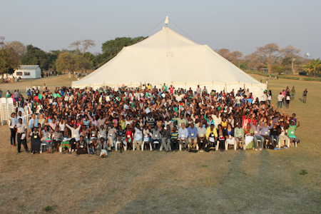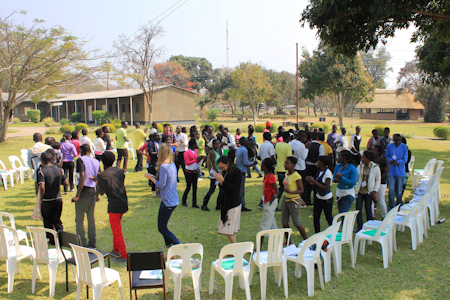 The acacia tree casts a distinct shadow when lit by the Zambian summer sun. Surrounding the grounds of the William Mmutle Masetlha Institute and the Banani International Secondary School, criss-crossed with aloe-lined paths and dotted with fiery pink bougainvillea bushes, its familiar shape and umbrella shade welcomed the almost 900 youth of Mozambique, Namibia, Zimbabwe, and Zambia to the Chibombo youth conference. As temperatures reached their peak, the grounds stood quiet until just after noon when the first group from Zambia arrived. Within an hour, organizers recognized the telltale cloud of dust signalling the arrival of two more large buses from Zimbabwe, followed within minutes by another two buses from Lusaka, three from the southern province, and one from Kabwe. The air filled with excitement as the energy, joy, and enthusiasm of the youth spilled out from the buses onto the grounds. The youth conference of Chibombo had begun.