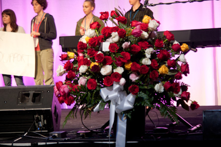 114 roses, representing the youth conferences taking place around the world, mark the stage at the conference centre. Donated by the local community, they reflect the spirit of the city described by ‘Abdu’l-Bahá, as the heart of its country