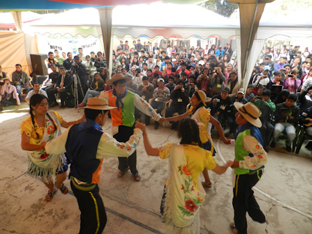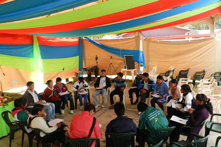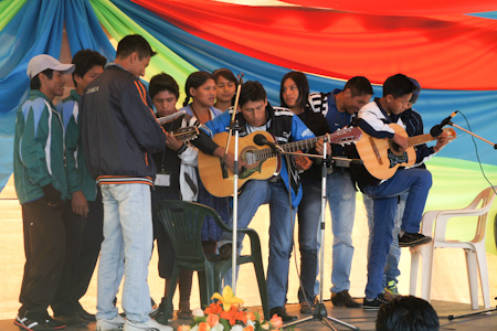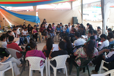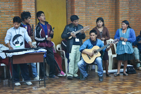 Full days of focused study and spirited consultations were followed by vibrant evening programmes that included arts presentations. One evening, the youth from Chuquisaca presented a zampoñada, a traditional musical piece where several zampoñas (Andean panpipes) are played simultaneously, creating a strong and energetic rhythm which captured the dynamic spirit of the conference. Everyone present followed this rhythm with clapping and singing, while dozens of youth spontaneously stood up from their seats and broke into dance, singing the lyrics that were composed especially for the occasion: “Oh! Youth of this time, let’s work, let’s serve…”