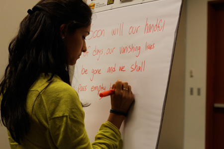 A participant writes the Words of ‘Abdu’l-Bahá for fellow group members
