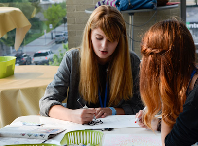 Two youth work together on an artistic representation of the themes they have been discussing