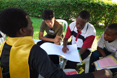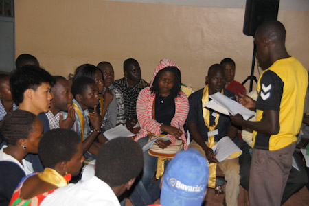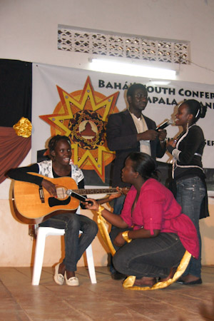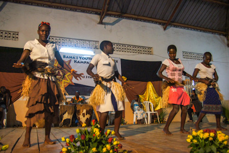 Over the course of these three days, each workshop group made use of artistic expressions to advance understanding of the various themes addressed in the materials. Skits, songs, dances, and poems were practiced during the breaks and later shared during the evening plenary sessions. Participants from South Sudan, for example, presented a skit exploring the opportunities for service to others that are created when we see all of humanity as members of a unified family. During the evening of the second day, a group from Masaka, in central Uganda, stirred the hearts of their peers by sharing a traditional Luganda dance—complete with engaging call and response lyrics, vibrant costumes, fastpaced drumming, and dynamic movements.