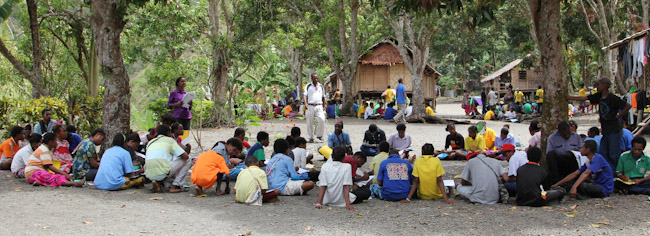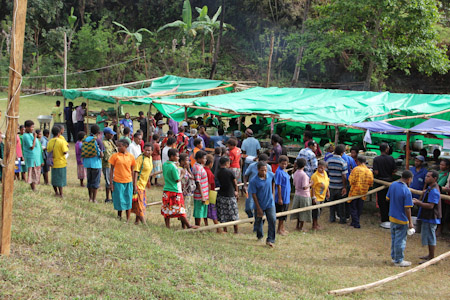 More than 1,000 community members—adults, younger youth, and children—took care of the conference logistics, ensuring that the multitude of participants had shelter, food, and all that was necessary for them to focus on their study of the conference materials. For days the local friends had worked together erecting makeshift sapling supported canvas shelters, a stage, pit latrines, and a mess hall for serving food. Villagers in and around Aragip emptied their gardens, filling up one of the storerooms at the school with produce.