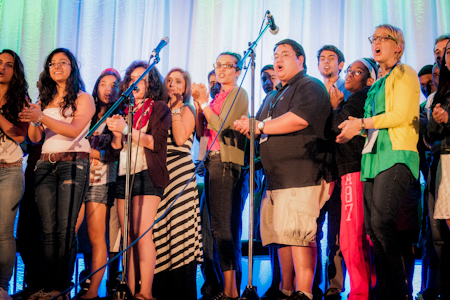 Arts were a significant aspect of the gathering as the participants found numerous creative ways to explore and express the concepts they studied during the weekend. One group performed a skit on the false choices that youth sometimes face, such as choosing between service or study, when in reality the two are essential aspects of a coherent life. Another group led the entire gathering in a rousing song on guitars and drums with the lyrics: “Two lungs take one breath, two feet walk one path, like two wings of one bird, we can kick it and serve!”