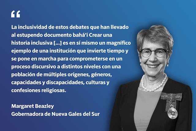 «La inclusividad de estos debates que han llevado al estupendo documento bahá’í Crear una historia inclusiva [...] es en sí mismo un magnífico ejemplo de una institución que invierte tiempo y se pone en marcha para comprometerse en un proceso discursivo a distintos niveles con una población de múltiples orígenes, géneros, capacidades y discapacidades, culturas y confesiones religiosas».