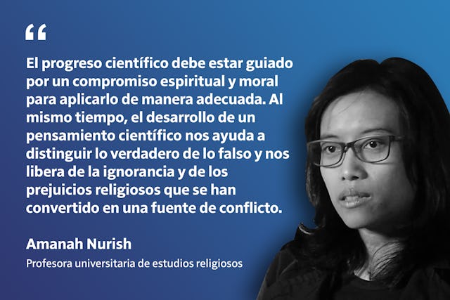 Cuando el debate se centró en el papel de la religión en un mundo de rápidos cambios tecnológicos, Amanah Nurish, profesora de estudios religiosos, señaló el principio bahá’í de la armonía entre la ciencia y la religión. «Este principio nos ayuda a apreciar el papel crucial que tanto la ciencia como la religión ejercen en el mundo moderno. El progreso científico debe estar guiado por un compromiso espiritual y moral para aplicarlo de manera adecuada. Al mismo tiempo, el desarrollo de un pensamiento científico nos ayuda a distinguir lo verdadero de lo falso y nos libera de la ignorancia y de los prejuicios religiosos que se han convertido en una fuente de conflicto».