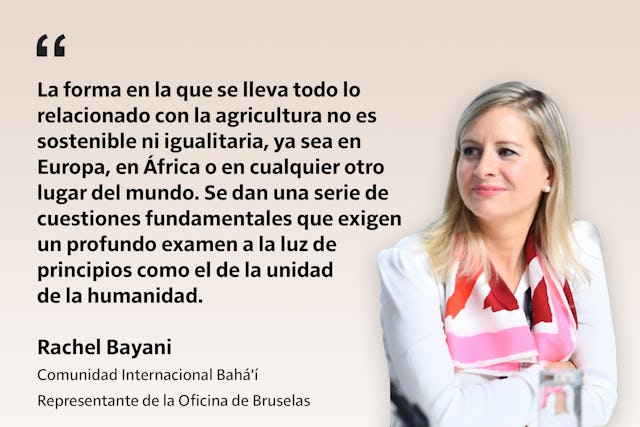 «La forma en la que se organizan los asuntos agrícolas no es sostenible ni equitativa, ya sea en Europa, en África o en cualquier otro lugar del mundo. Se dan una serie de cuestiones fundamentales que exigen un profundo examen a la luz de principios como el de la unidad de la humanidad», afirma Rachel Bayani de la Oficina de Bruselas de la Comunidad Internacional Bahá’í (CIB) en un seminario en línea celebrado por la Oficina el miércoles pasado.