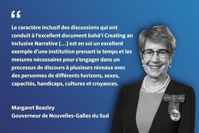« Le caractère inclusif des discussions qui ont conduit à l’excellent document bahá’í Creating an Inclusive Narrative […] est en soi un excellent exemple d’une institution prenant le temps et les mesures nécessaires pour s’engager dans un processus de discours à plusieurs niveaux avec des personnes de différents horizons, sexes, capacités, handicaps, cultures et croyances. »