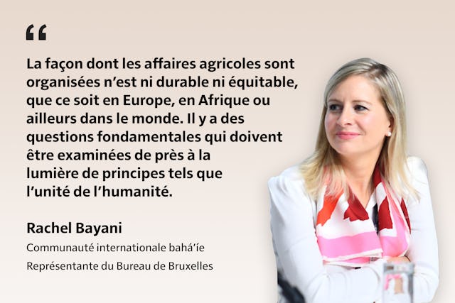 « La façon dont les affaires agricoles sont organisées n’est ni durable ni équitable, que ce soit en Europe, en Afrique ou ailleurs dans le monde. Il y a des questions fondamentales qui doivent être examinées de près à la lumière de principes tels que l’unité de l’humanité », a déclaré Rachel Bayani du Bureau de Bruxelles de la Communauté internationale bahá’íe (BIC), lors d’un séminaire en ligne organisé par le Bureau, mercredi dernier.