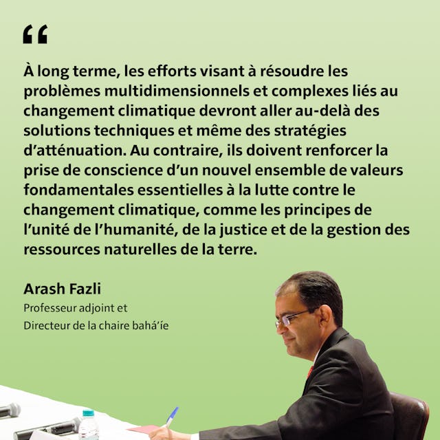 « À long terme, les efforts visant à résoudre les problèmes multidimensionnels et complexes liés au changement climatique devront aller au-delà des solutions techniques et même des stratégies d’atténuation. Au contraire, ils doivent renforcer la prise de conscience d’un nouvel ensemble de valeurs fondamentales essentielles à la lutte contre le changement climatique, comme les principes de l’unité de l’humanité, de la justice et de la gestion des ressources naturelles de la terre », a précisé Arash Fazli, professeur adjoint et directeur de la chaire bahá’íe, lors de la réunion.