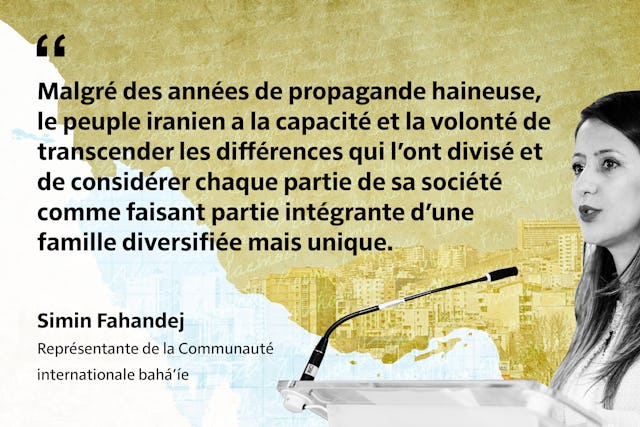 « Our Story Is One appelle les Iraniens à se voir au-delà des récits d’altérité et de division créés par le gouvernement iranien, et plutôt à considérer tous les individus et tous les groupes comme des êtres humains dont les histoires, les vies et le bien-être sont interconnectés », a déclaré Simin Fahandej, représentante du BIC auprès des Nations unies à Genève. « Cette déclaration, émanant de plus de 150 leaders de pensée iraniens, est une affirmation de ce même message. Malgré des années de propagande haineuse, le peuple iranien a la capacité et la volonté de transcender les différences qui l’ont divisé – croyances, ethnies, autres origines – et, au contraire, de considérer chaque partie de sa société comme faisant partie intégrante d’une famille diversifiée mais unique. »