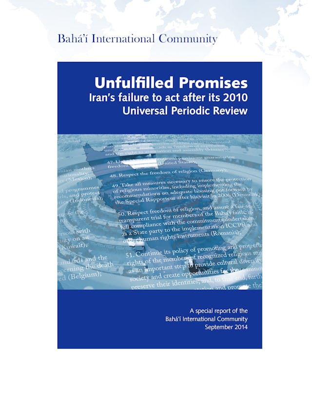 Titled "Unfulfilled Promises", and launched today at the United Nations headquarters in Geneva, the report discusses 34 specific pledges made by Iran in February 2010 at the UN Human Rights Council that in some way could address human rights violations faced by members of Iran's Baha'i community.