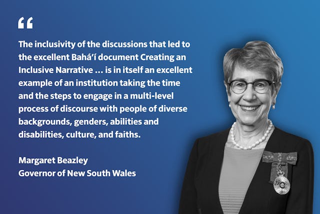 The Creating an Inclusive Narrative document, recordings of conference sessions, and more information about the project can be found on the website of the Australian Bahá’í community’s Office of External Affairs.