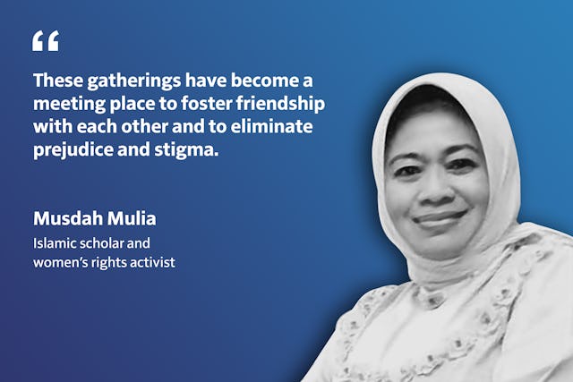 Musdah Mulia, a prominent Islamic scholar and women’s rights activist who has collaborated with the Office in holding the gatherings, comments on the character of the spaces, stating: “They are very positive and constructive in efforts to build peace in Indonesia. They involve people from different beliefs and religious backgrounds and help to bridge the differences among them. These gatherings have become a meeting place to foster friendship with each other and to eliminate prejudice and stigma.