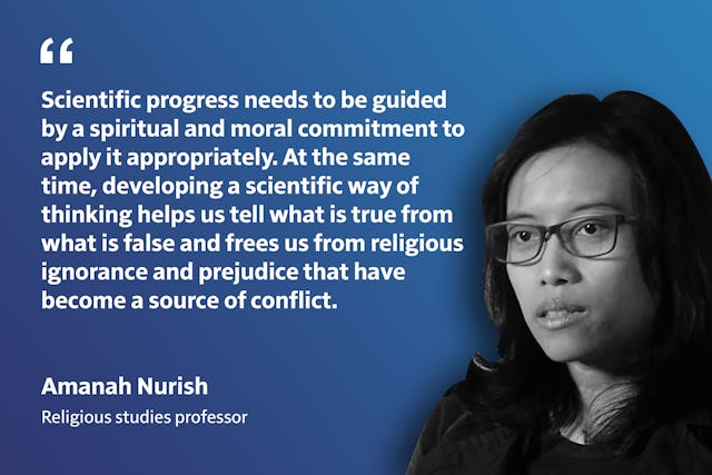 When discussion turned to the role of religion in a world of rapid technological change, Amanah Nurish, a professor of religious studies, pointed to the Bahá’í teaching of the harmony of science and religion. “This principle helps us see the critical role that both science and religion play in the modern world. Scientific progress needs to be guided by a spiritual and moral commitment to apply it appropriately. At the same time, developing a scientific way of thinking helps us tell what is true from what is false and frees us from religious ignorance and prejudice that have become a source of conflict.”
