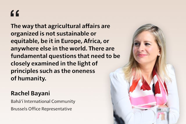 “The way that agricultural affairs are organized is not sustainable or equitable, be it in Europe, Africa, or anywhere else in the world. There are fundamental questions that need to be closely examined in the light of principles such as the oneness of humanity,” said Rachel Bayani of the Brussels Office of the Bahá’í International Community (BIC) at an online seminar held by the Office last Wednesday.