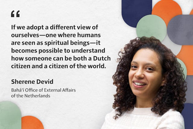 “This assumption is inevitable if you think individuals have a singular identity, and that identity is synonymous with their nationality or culture,” she continues, “But if we adopt a different view of ourselves—one where humans are seen as spiritual beings—it becomes possible to understand how someone can be both a Dutch citizen and a citizen of the world.”